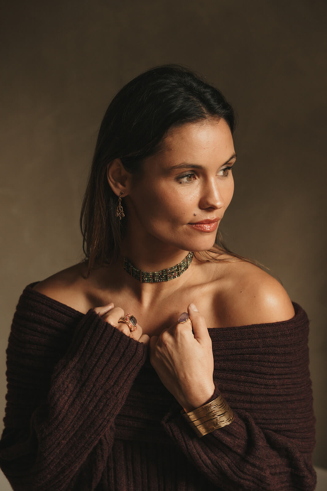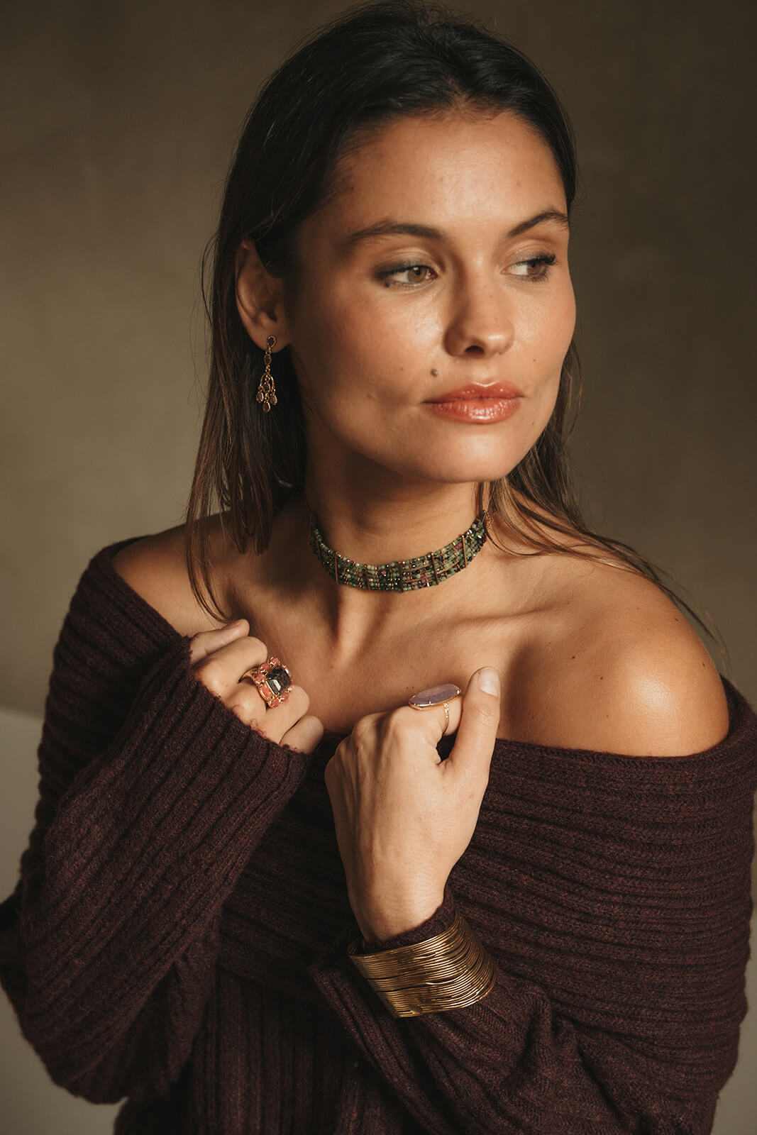 Porté près du cou, il sublime instantanément le décolleté et devient la pièce forte de ta tenue. Un bijou d’exception pour celles qui aiment allier originalité, énergie naturelle et sophistication.