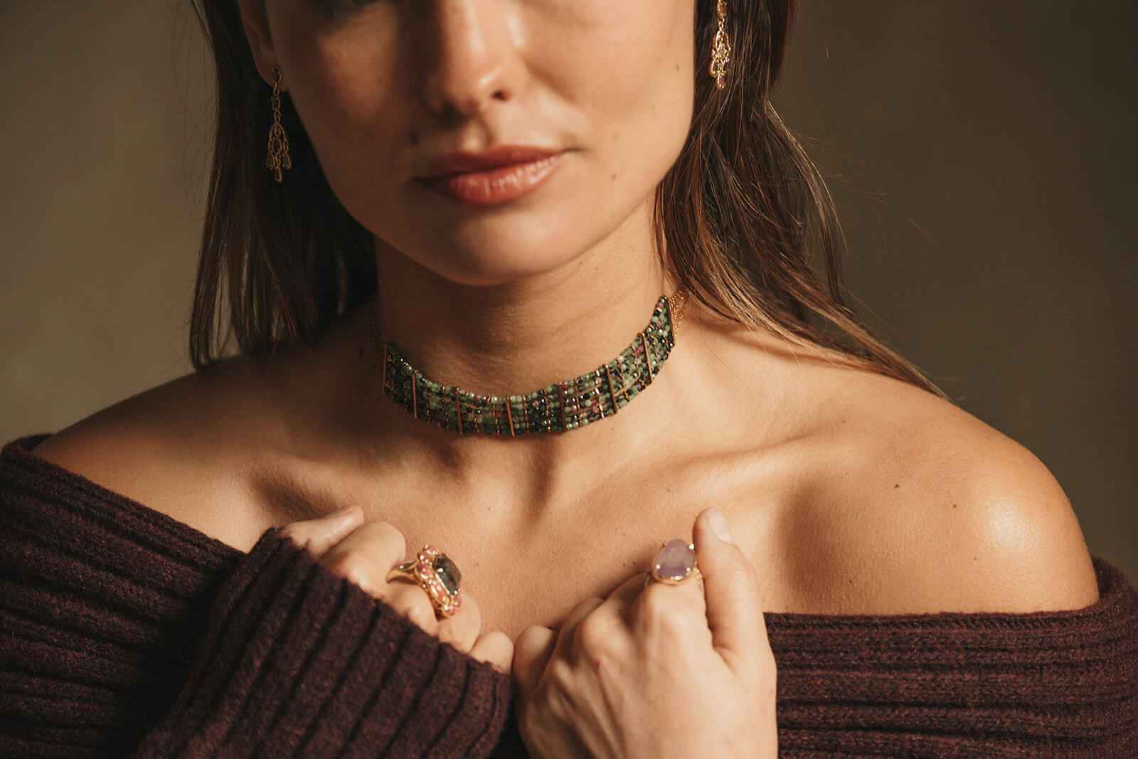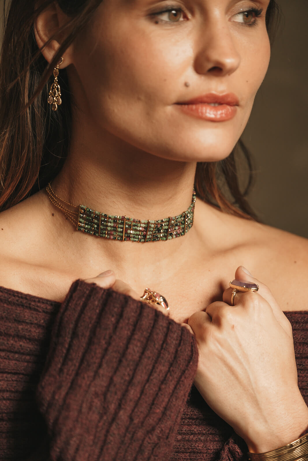 Audacieux et raffiné, ce collier se distingue par son design large composé de pierres naturelles de rubis zoïsite, une pierre aux nuances uniques mêlant vert intense et inclusions rubis rosées.