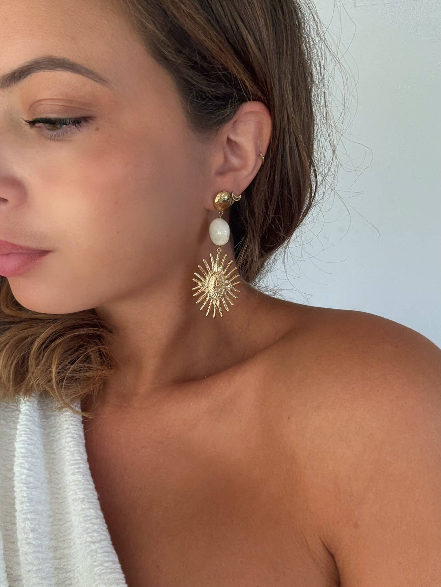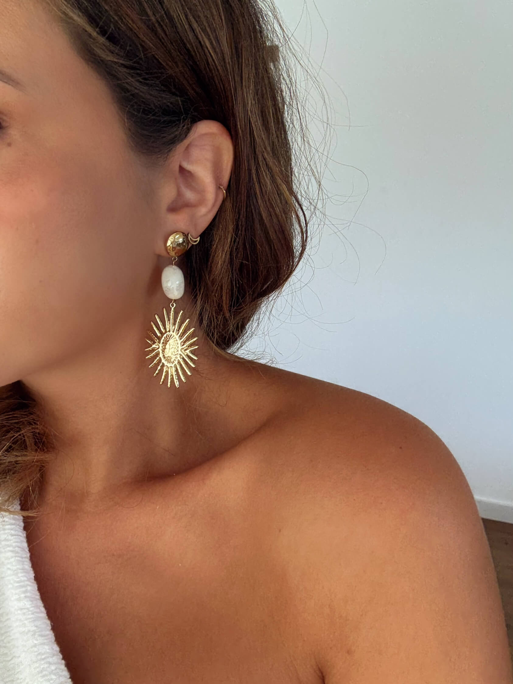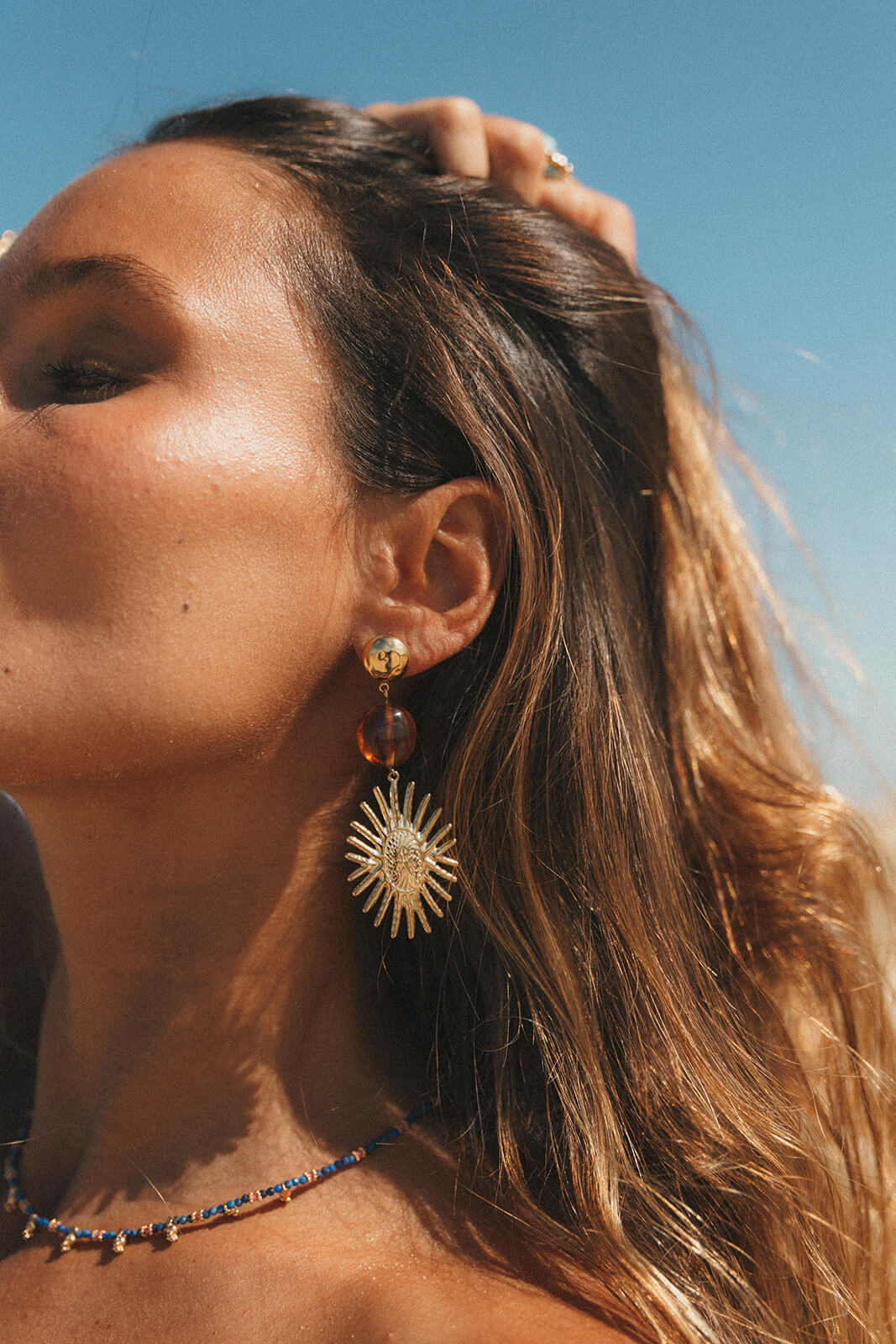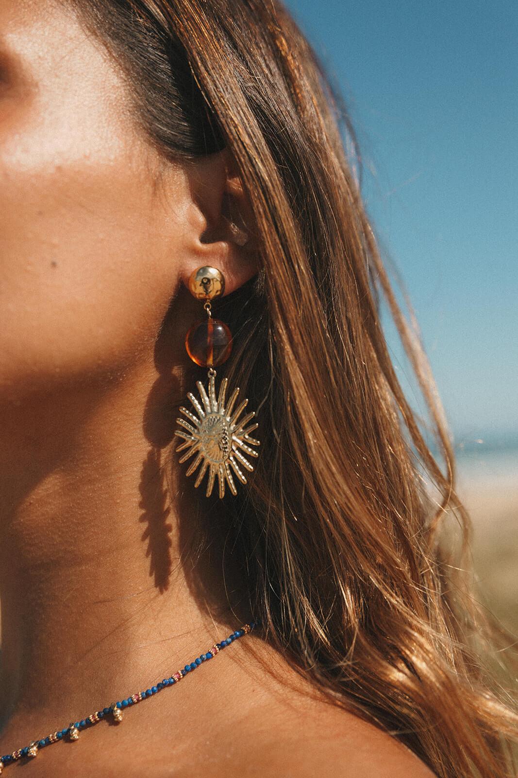 Succombez au charme unique de ces boucles d’oreilles pendantes composées de trois éléments distincts : une demi-boule martelée, une boule en acétate colorée et une fleur ovale texturée.
