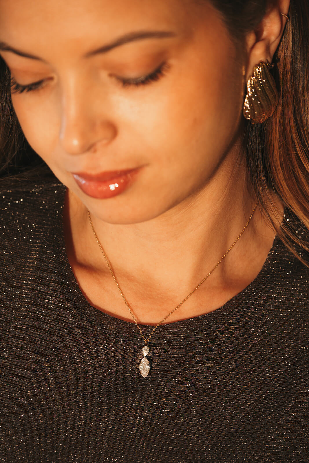 Élégant et intemporel, ce collier en acier inoxydable doré est orné d’un pendentif serti d’oxydes de zirconium, offrant une brillance éclatante comparable à celle du diamant.