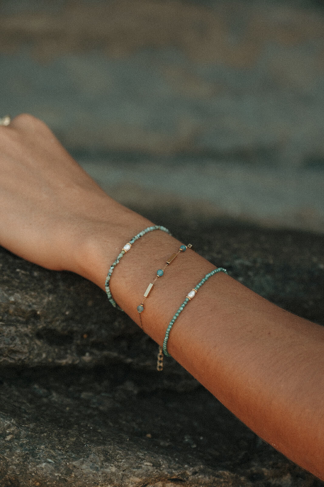 Pierres naturelles rondes, aux reflets uniques, qui rappellent les nuances de l’océan et du sable doré.