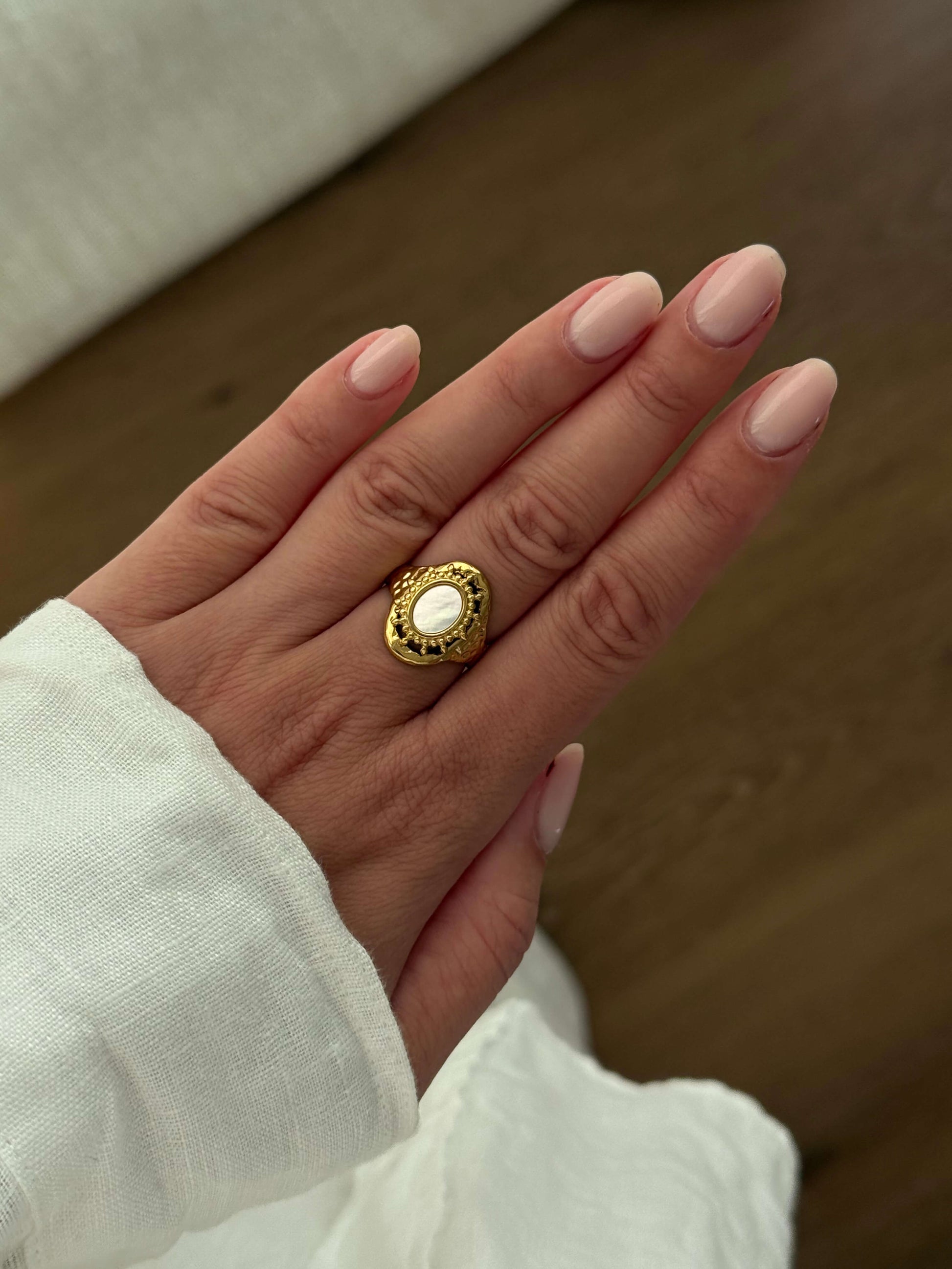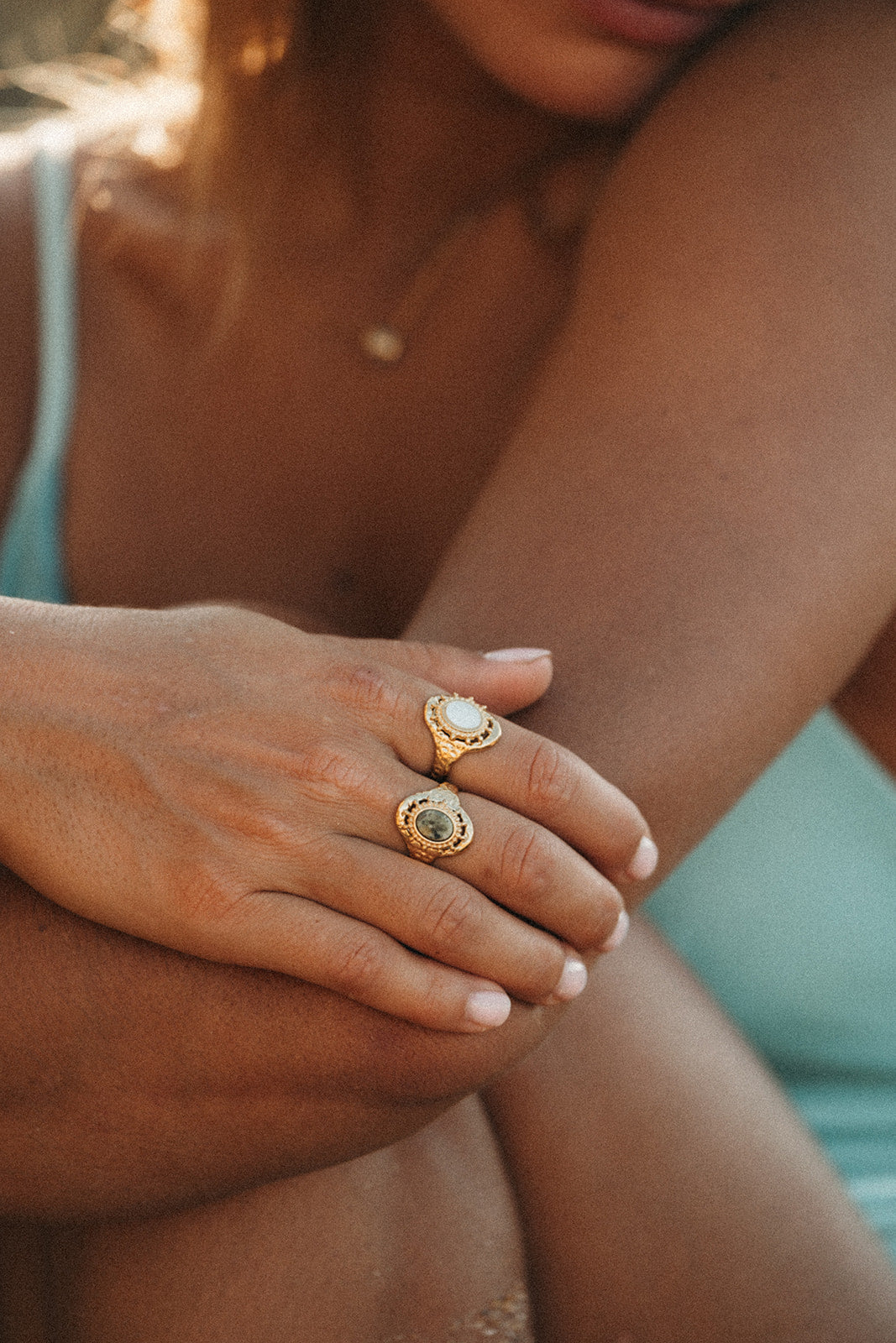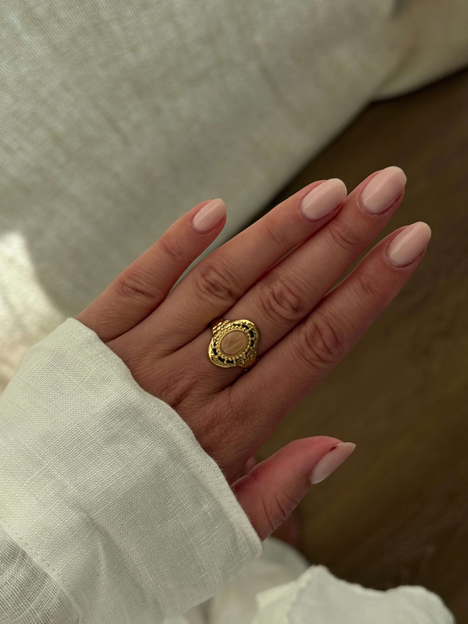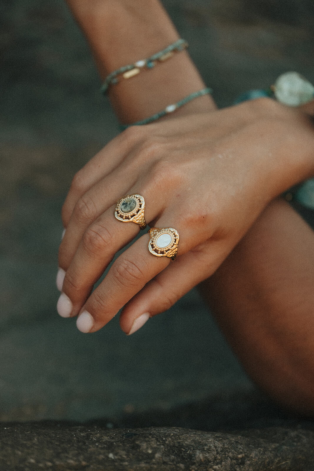 Cette bague en acier inoxydable allie élégance et authenticité avec sa pierre naturelle placée au centre, mise en valeur par un design raffiné et intemporel.