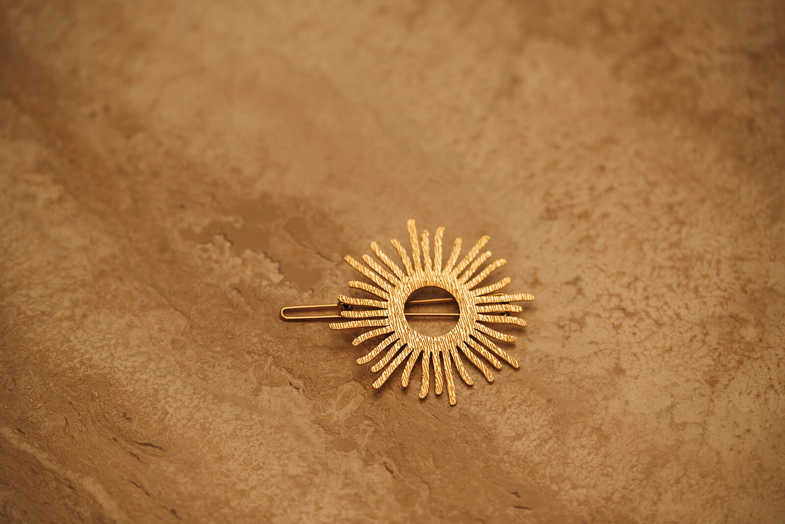 Éclatante et raffinée, cette pince à cheveux en laiton doré prend la forme d’un soleil rayonnant qui illumine instantanément votre coiffure.