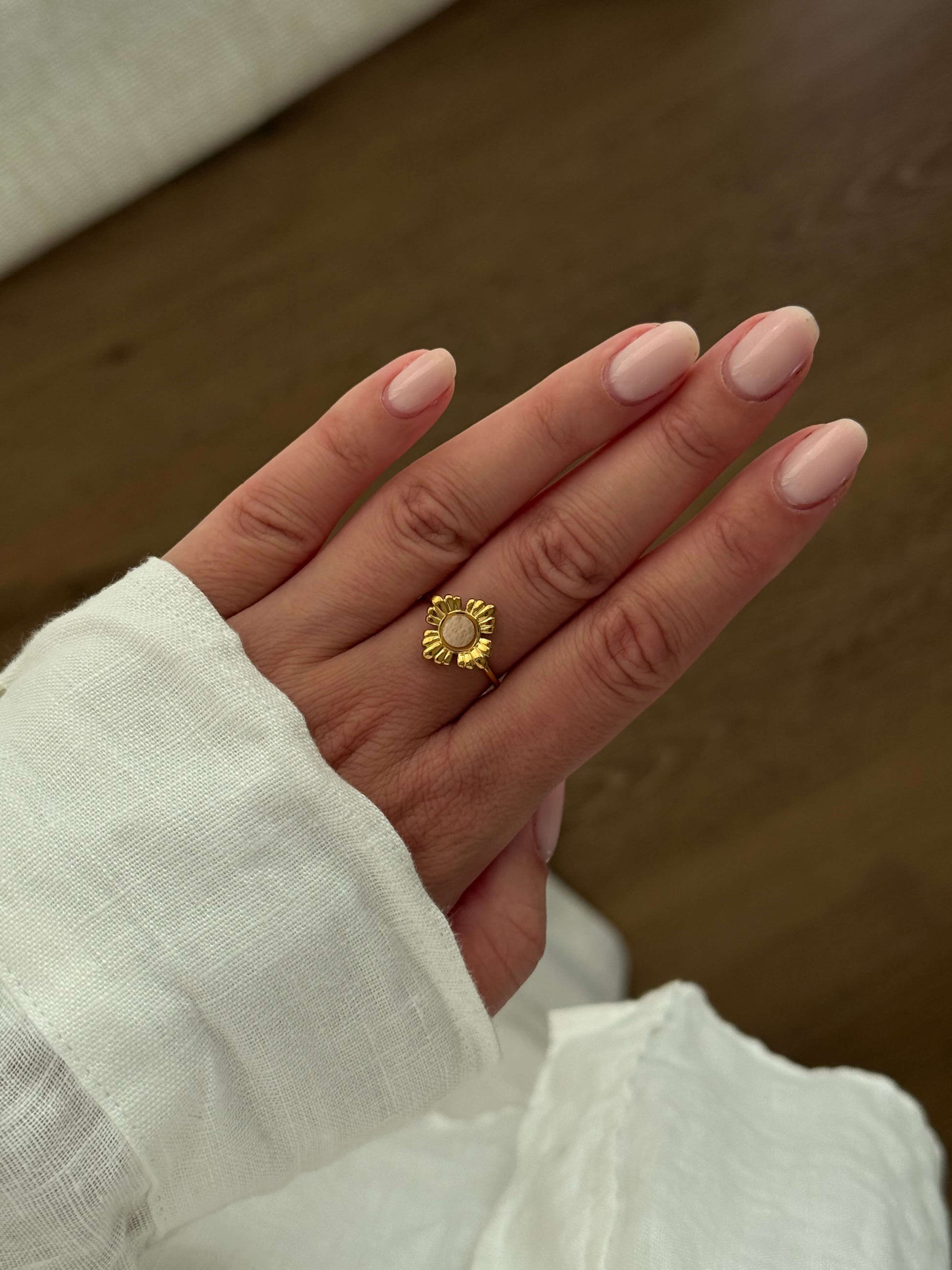 Cette bague fine en acier inoxydable séduit par son design délicat en forme de fleur, sublimée par de véritables pierres naturelles qui apportent éclat et authenticité.