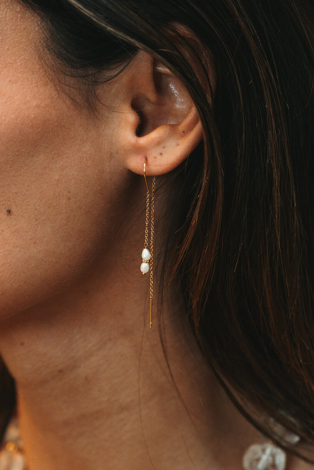 Élégantes et aériennes, ces boucles d’oreilles en acier inoxydable doré sont sublimées par deux perles d’eau douce naturelles.