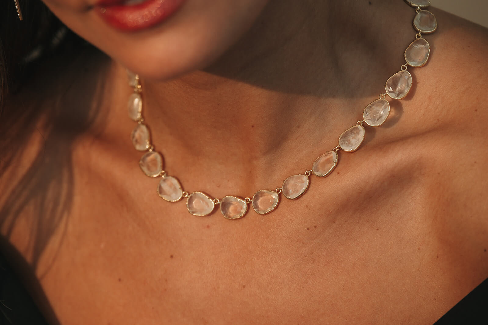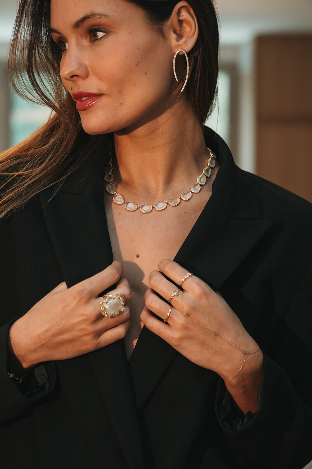 Élégant et lumineux, ce collier se compose de pierres naturelles taillées en triangles arrondis, offrant un éclat délicat et moderne. Son fermoir bouée ajoute une touche tendance tout en garantissant une fermeture pratique et sécurisée.