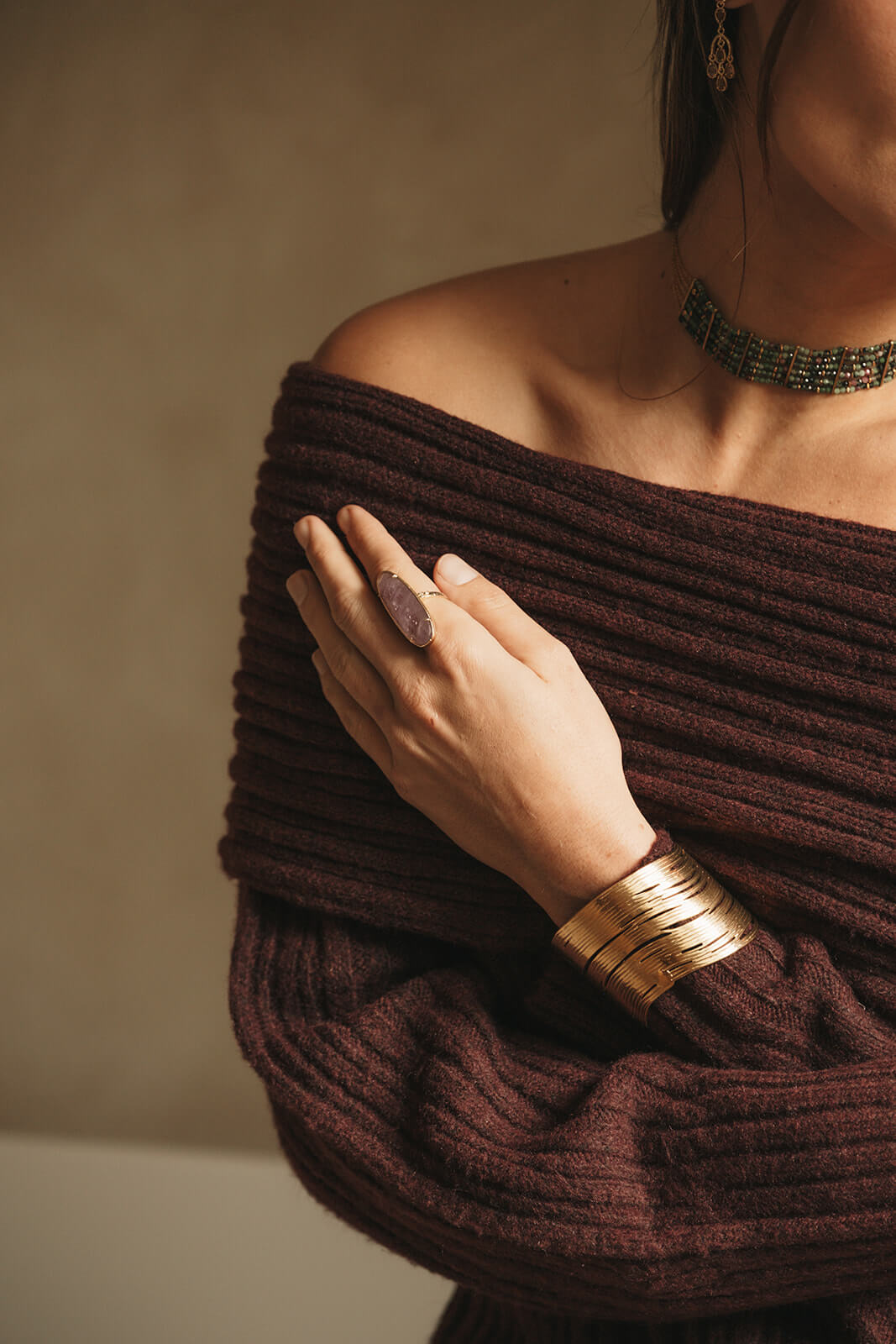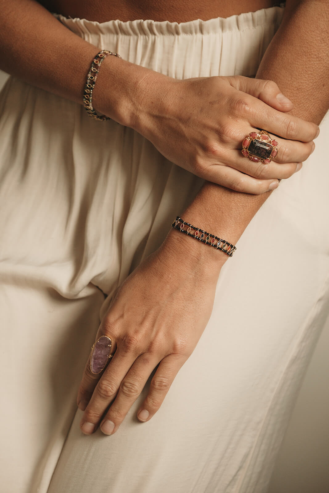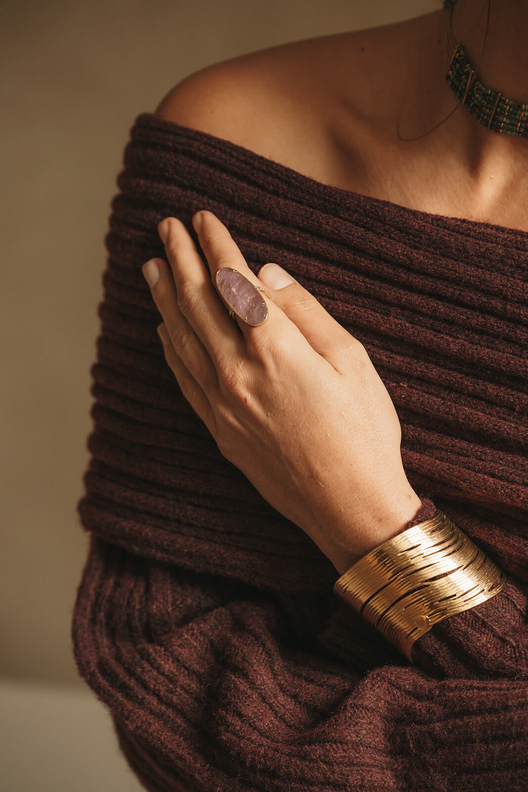 Cette bague ajustable épouse parfaitement votre doigt grâce à sa taille unique flexible. Ornée de pierres naturelles authentiques : améthyste et quartz fraise vert, elle capture la sérénité et l'énergie de la nature.