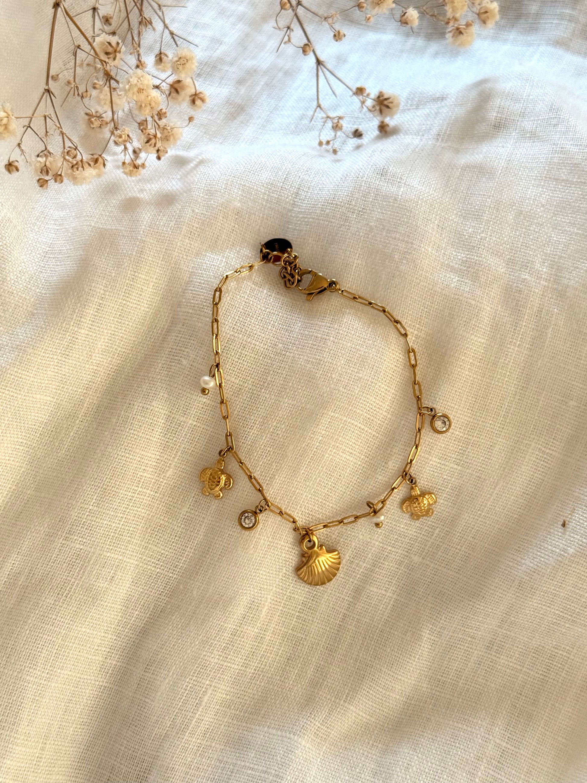 Laissez-vous emporter par ce bracelet en acier inoxydable, sublimé par une chaîne fine à maillons ovales et de délicates breloques inspirées de l’océan : coquillage, cauri, petite tortue, perles d’eau douce et éclats de cristal.