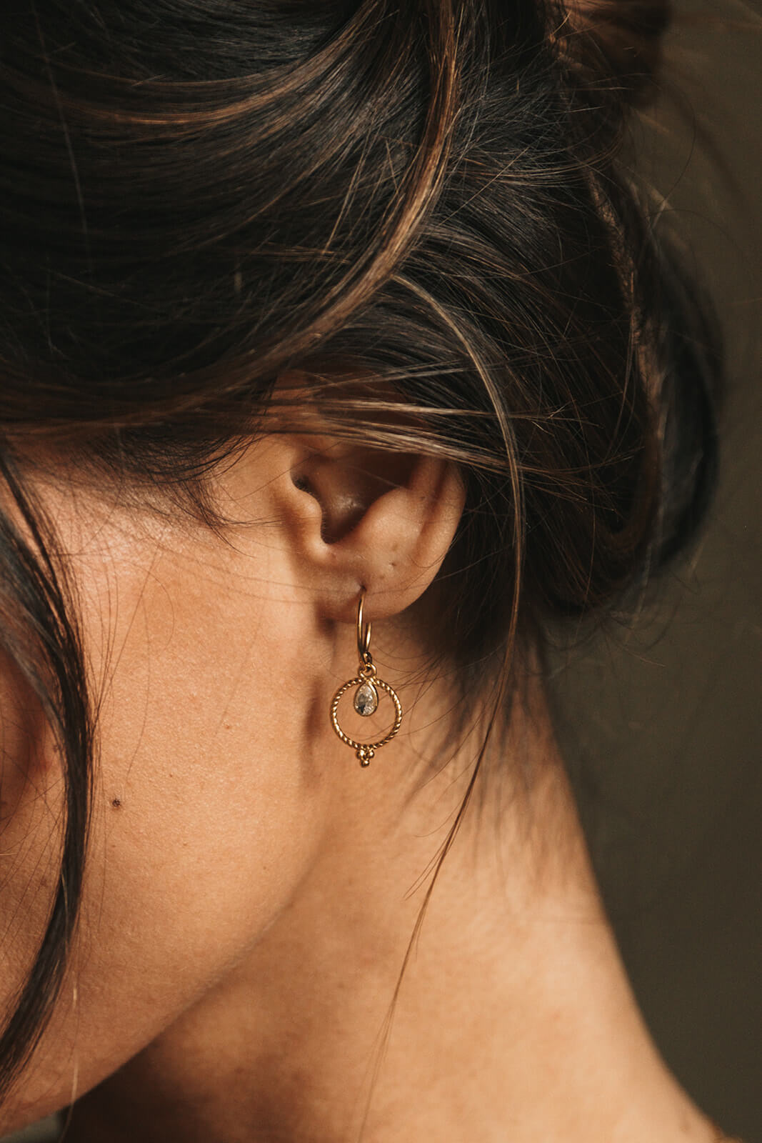 Élégantes et délicates, ces boucles d’oreilles en acier inoxydable se composent d’un anneau finement texturé orné d’un petit strass qui capte la lumière avec subtilité.