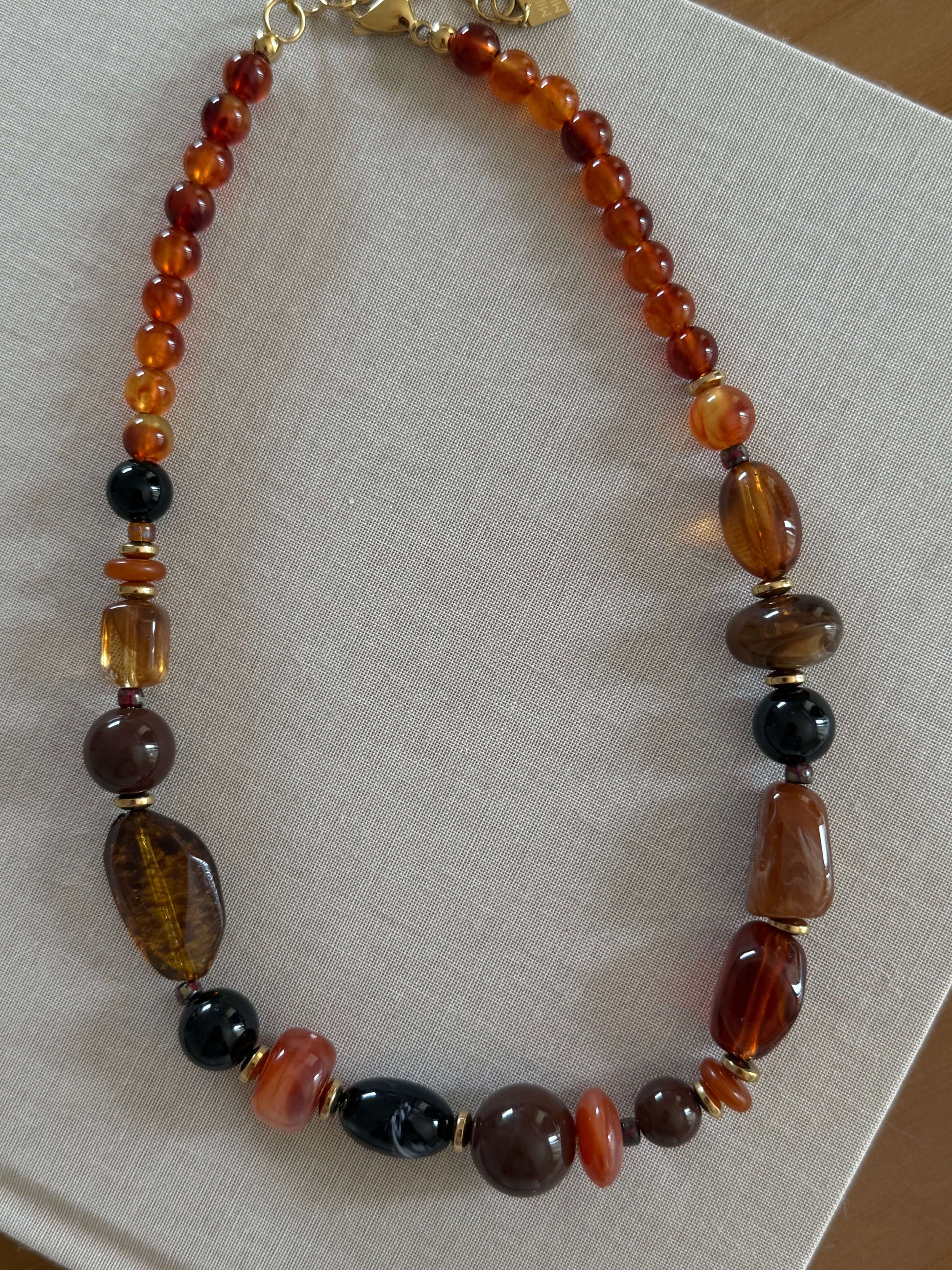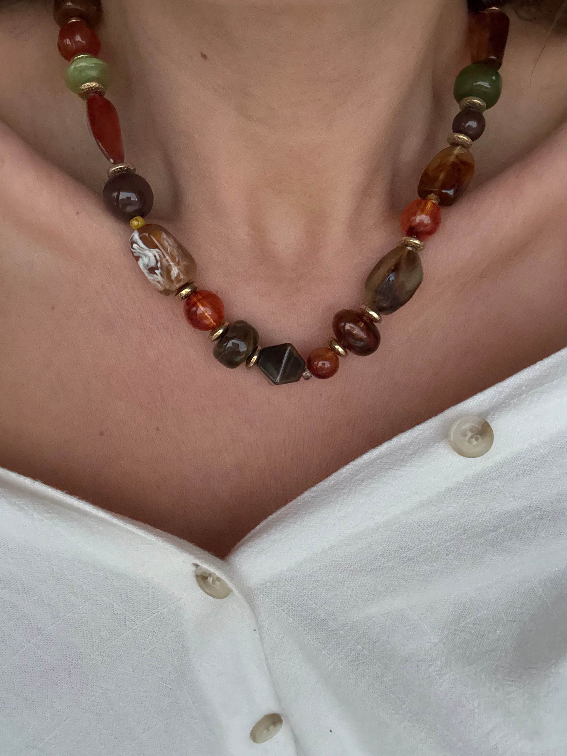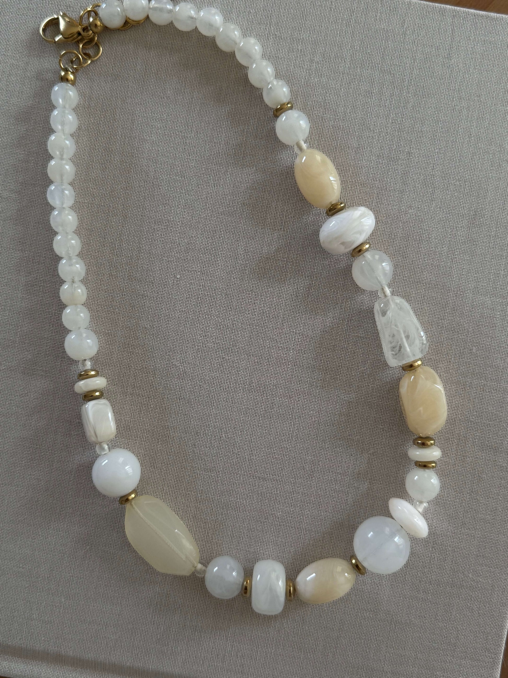 Craquez pour ce superbe collier perlé en résine écru sublimé par de délicates touches dorées.