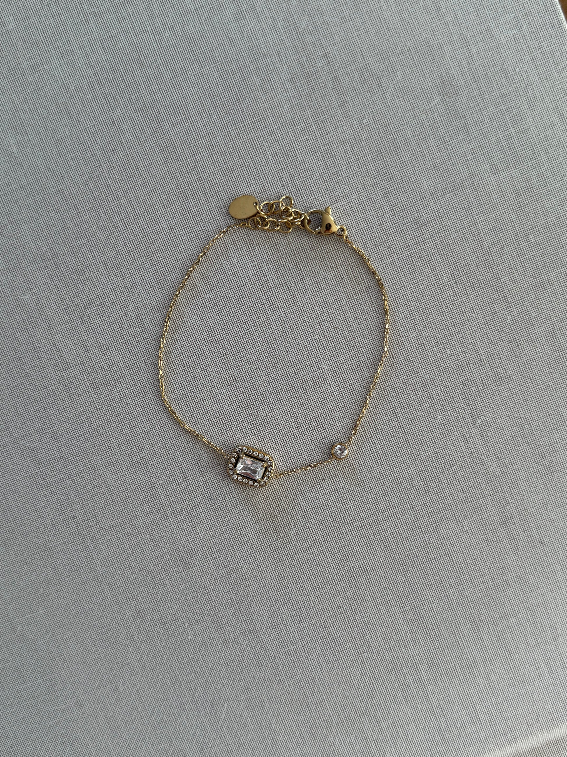 Composé d'une chaîne en acier inoxydable résistant, ce bracelet met en avant un magnifique cristal rectangulaire serti de délicats oxydes de zirconium qui captent la lumière avec grâce.