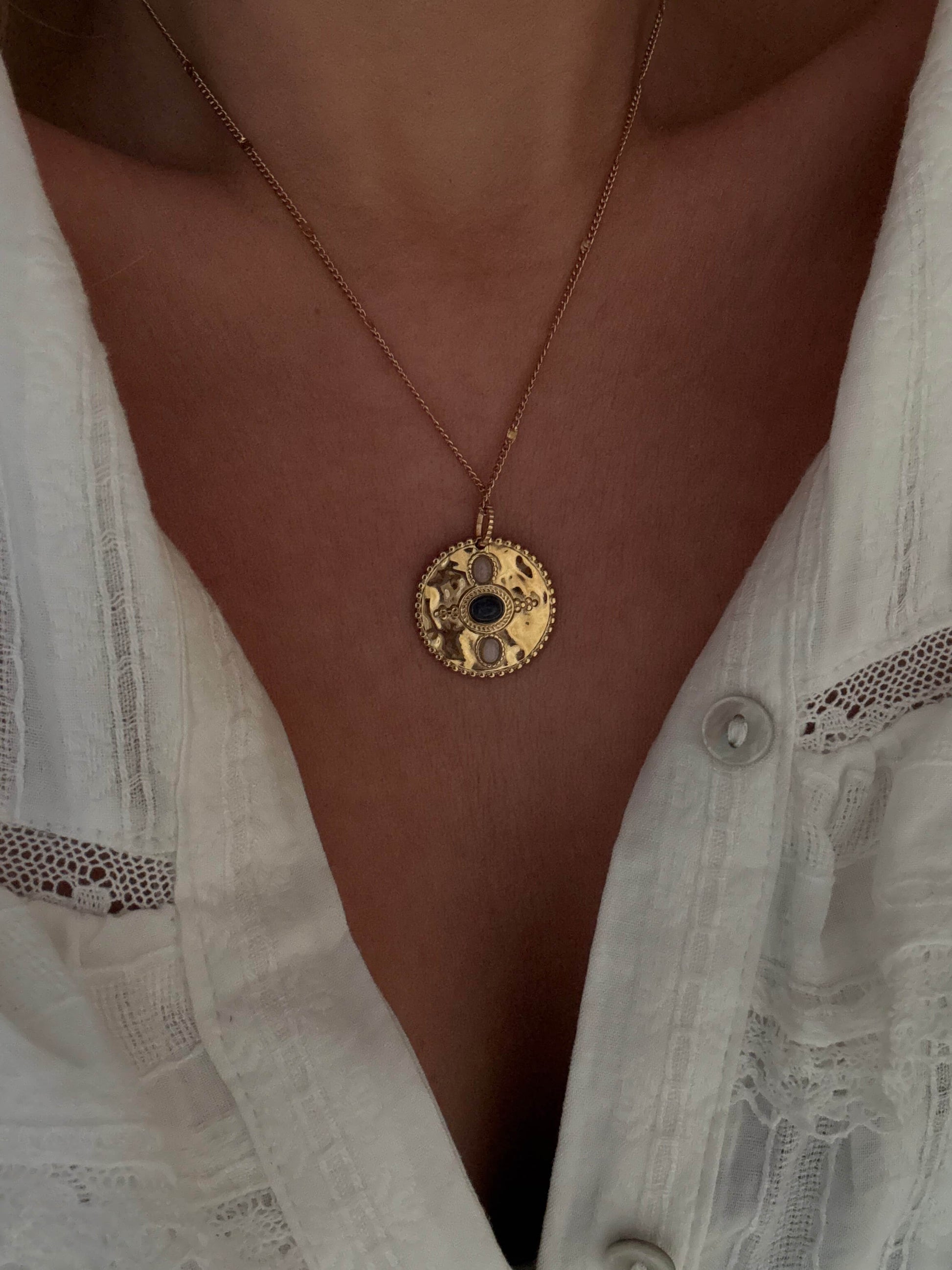 Le collier Nairobi en acier inoxydable se remarque par son médaillon martelé et ses pierres naturelles, alliant charme ethnique et élégance.