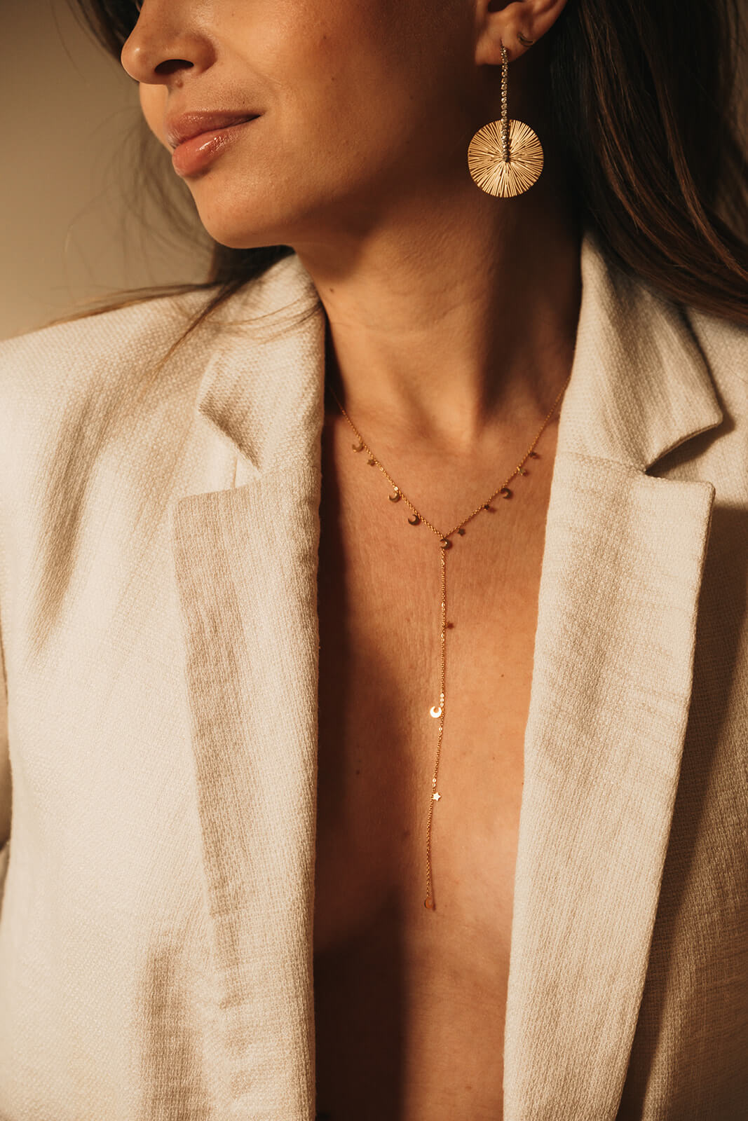 Minimaliste et féminin, le collier en Y dévoile une ligne délicate qui glisse subtilement le long du décolleté.
