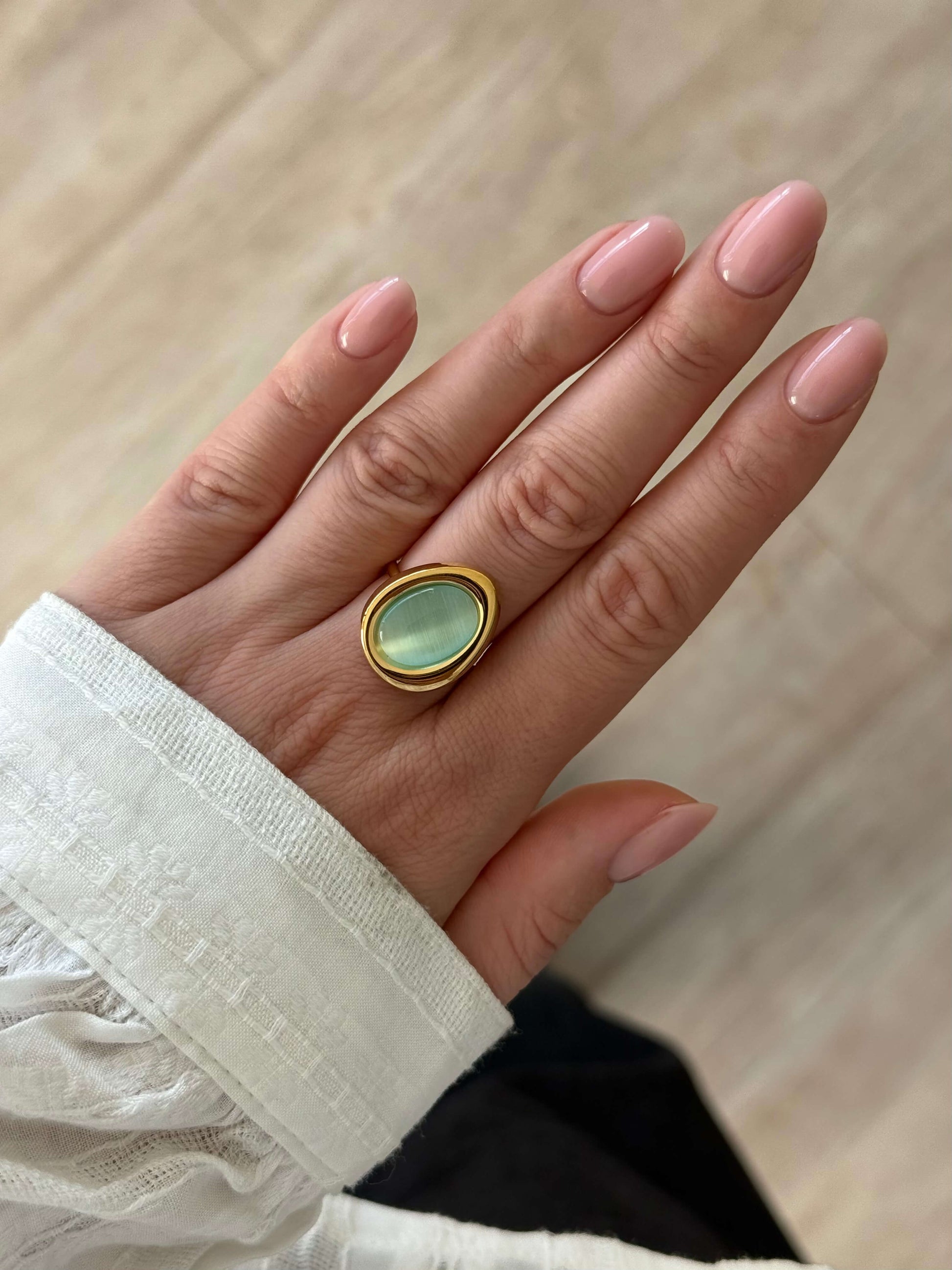 Élégante et lumineuse, cette bague en acier inoxydable doré est sublimée par une pierre Œil de chat aux reflets soyeux et hypnotiques. Sa forme ovale et ses nuances douces captent la lumière et apportent une touche raffinée et moderne à la main.