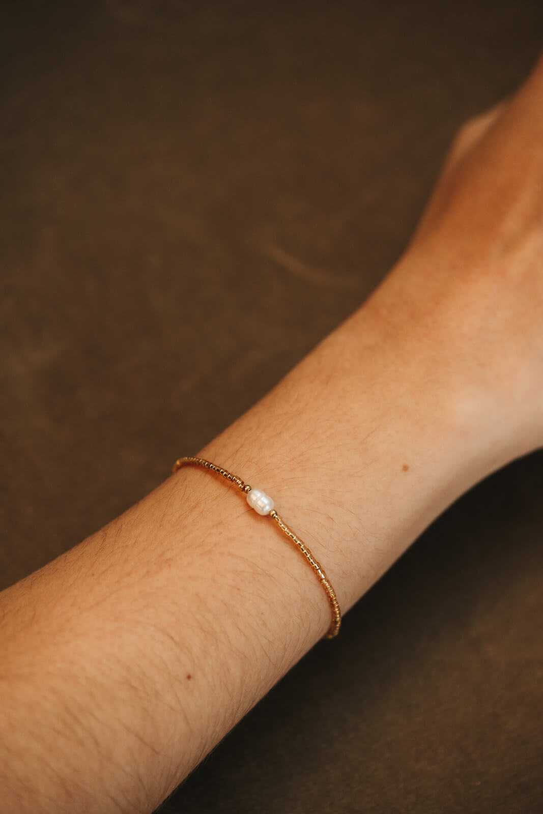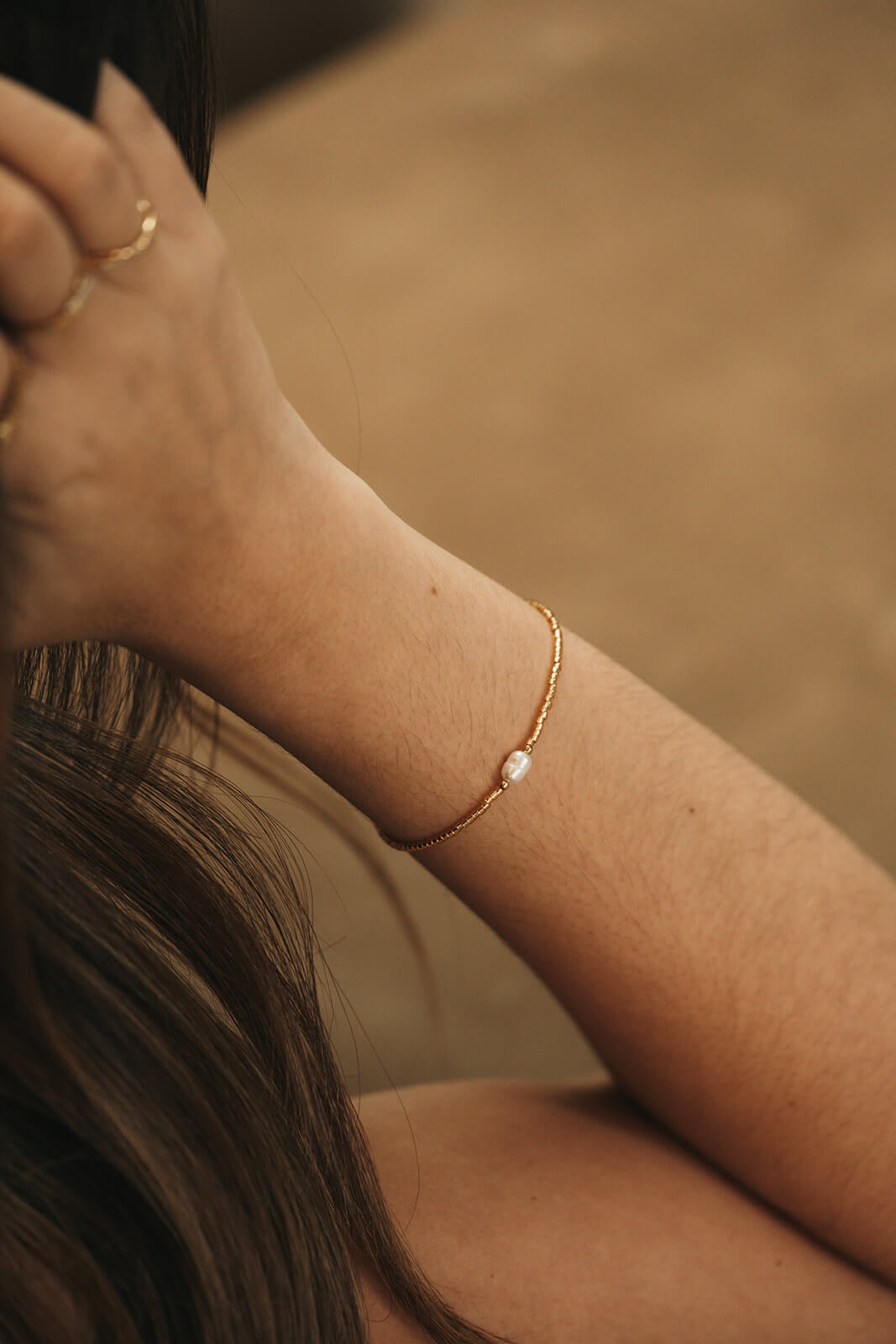 Élégant et minimaliste, ce bracelet associe la finesse des perles Miyuki à la douceur d’une perle d’eau douce, pour un rendu délicat et lumineux.
