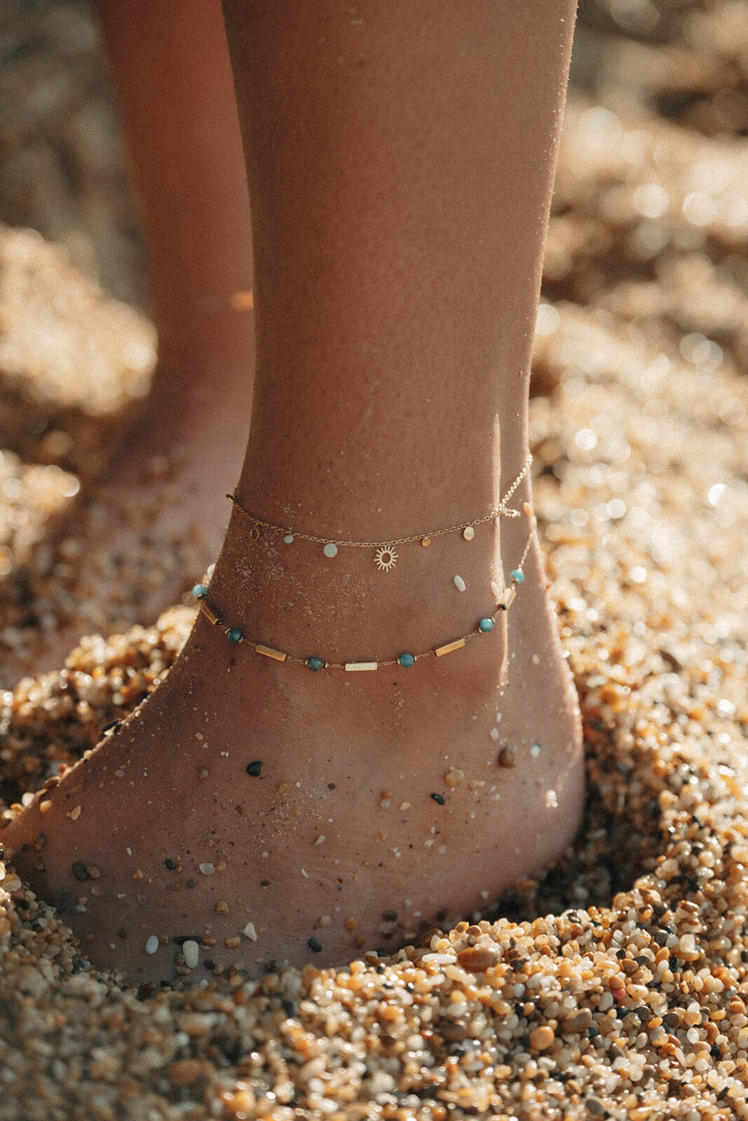Cette chaîne de cheville est une véritable invitation au soleil. Sa chaîne fine est ornée de pampilles soleil, rappelant l’éclat des journées d’été.