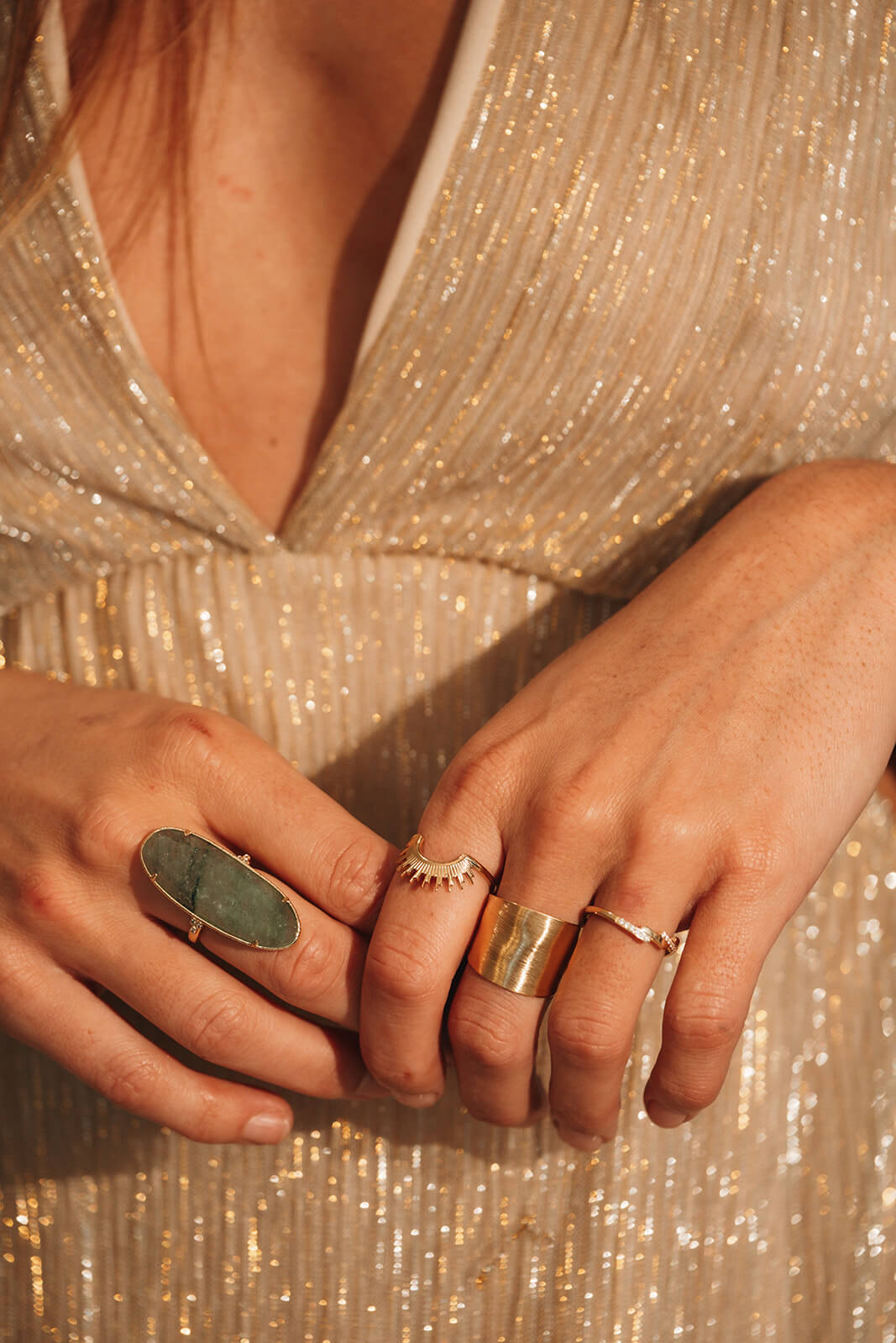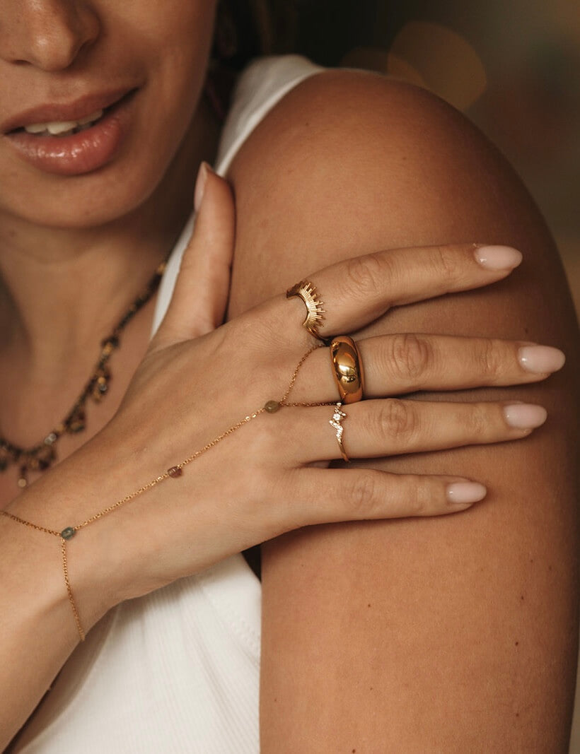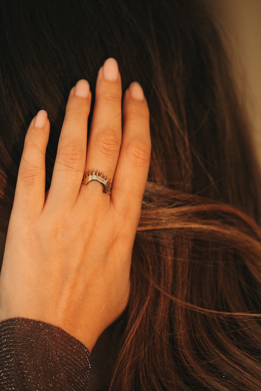 La bague Soleia illumine la main avec son design solaire et audacieux.